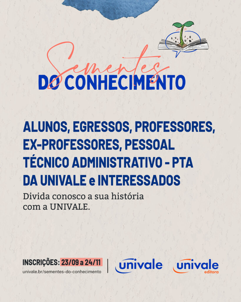“Sementes do Conhecimento” é um convite para alunos, egressos e professoras/professores da UNIVALE registrarem suas trajetórias, evidenciando como a formação acadêmica pode florescer em impacto social, humano e regional.